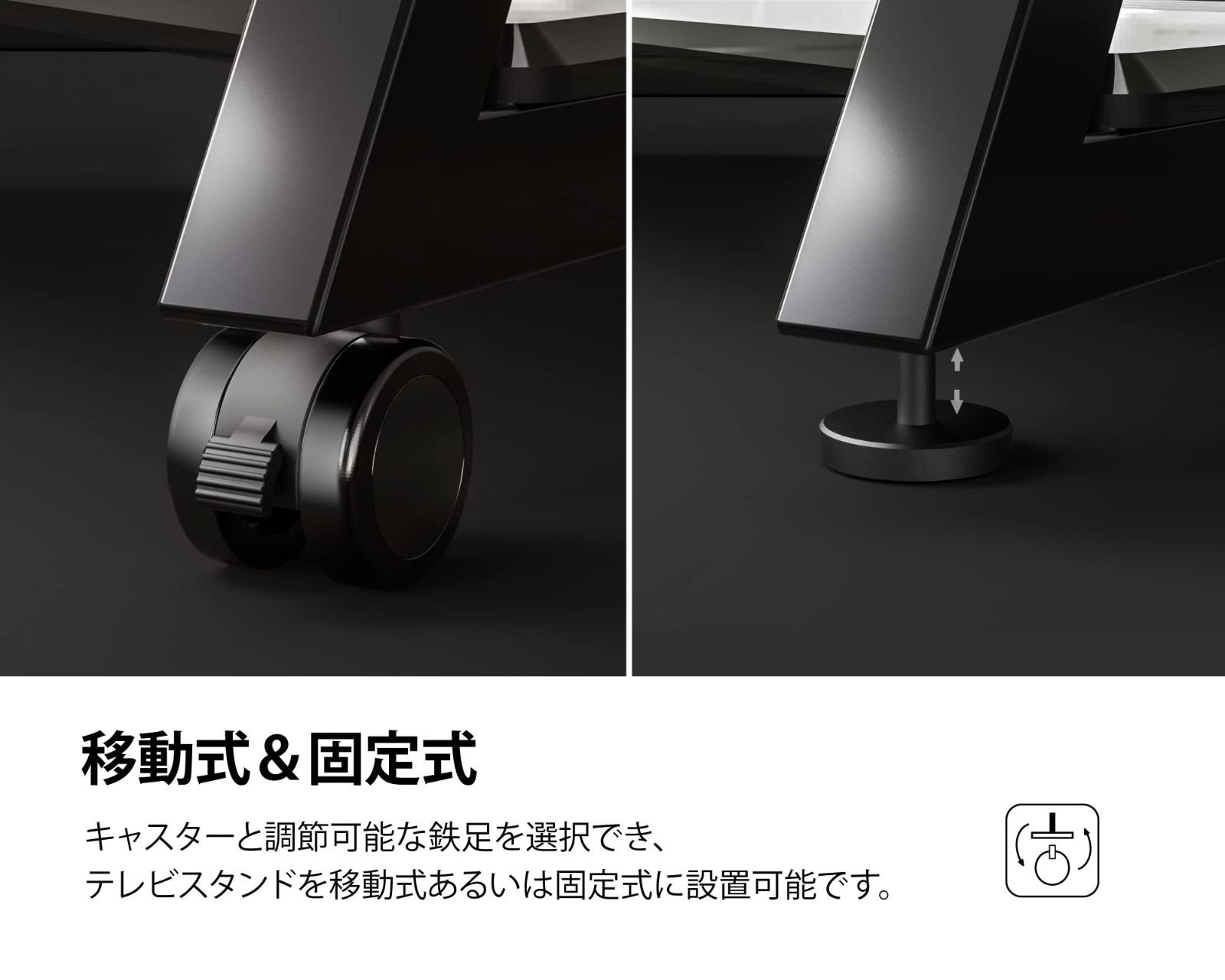 【固定式&移動式】このテレビスタンドは取り外し可能なキャスターが付いており、移動式と固定式を自由に選べます。壁に寄せて設置することができ、コーナーで放置でき、スペースを効率的に利用し、キャスター付きには掃除や部屋の模様替え時などの際に動かしやすいのが魅力です。簡単に操作できるストッパーも搭載しているので、スムーズに固定できます。