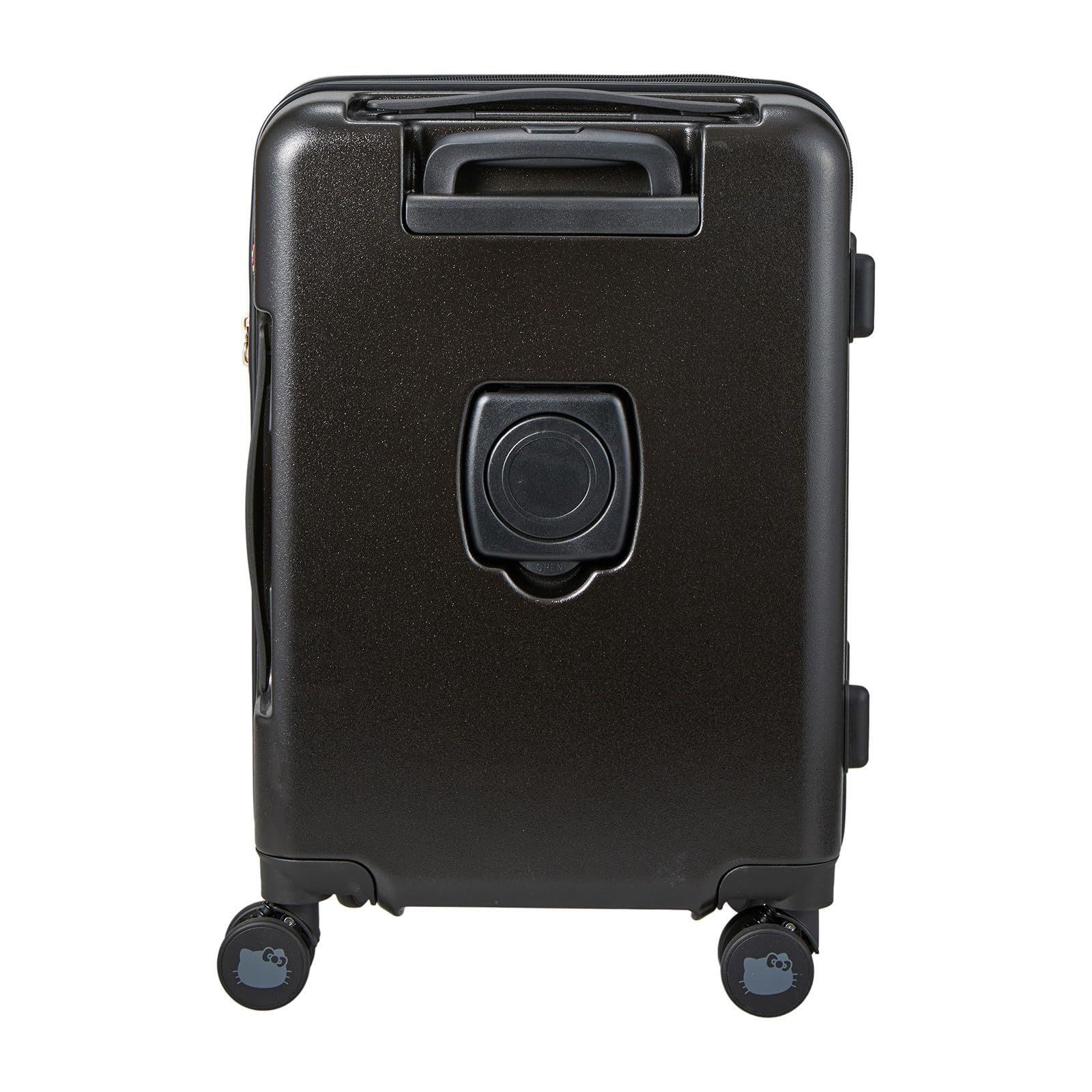 日焼けデザインのハローキティのスーツケース。日焼けデザインのハローキティがピンクのヒョウ柄リボンをつけたお顔がかわいい。スーツケースのブラックのボディに映えるピンクのロゴも大人かわいいデザインです。キャスターにはハローキティのお顔のシルエットが描かれています。スーツケース側面にはひょっこりと覗くハローキティのタグがついており、ファスナートップにはHELLO KITTYロゴが刻印されています。内装はヒョウ柄。細部までこだわったデザインです。