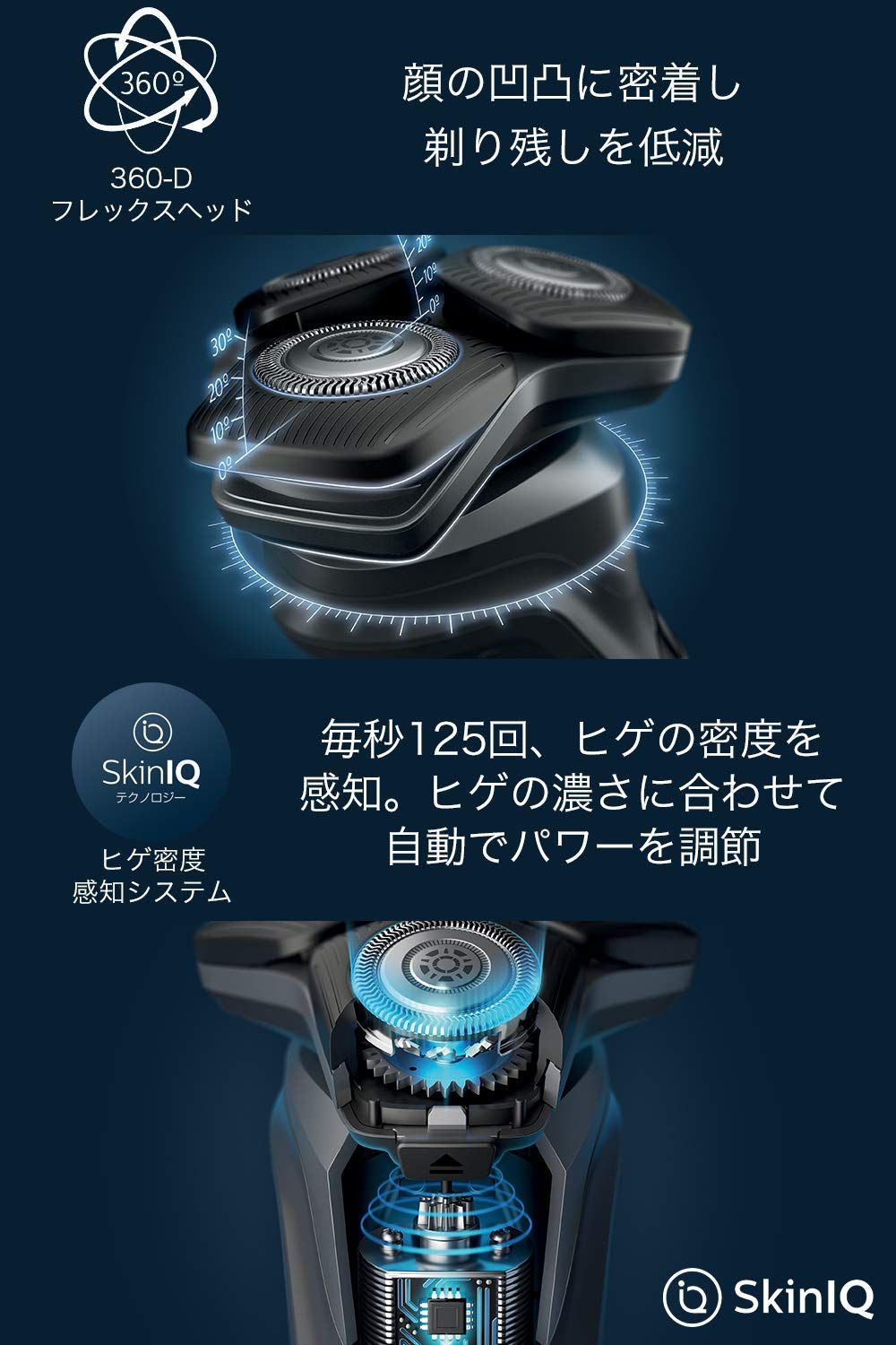 SkinIQテクノロジー360-Dフレックスヘッド:顔の凹凸に密着し、剃り残しを低減ヒゲ密度感知システムヒゲの濃さや生え方、顔の輪郭を感知し、一人ひとりの個性に合わせたシェービングへガイド・最適