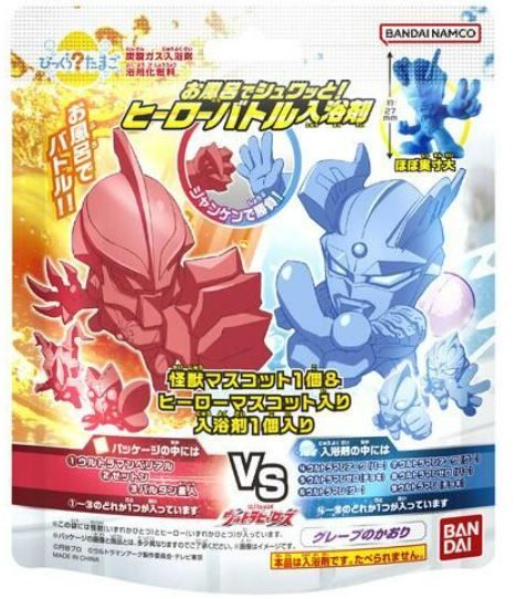 ウルトラヒーローズよりびっくらたまごです。ラインナップは全6種類。グレープの香りのする球型の入浴剤です。入浴剤がお湯に溶けると紫色のお湯になります。