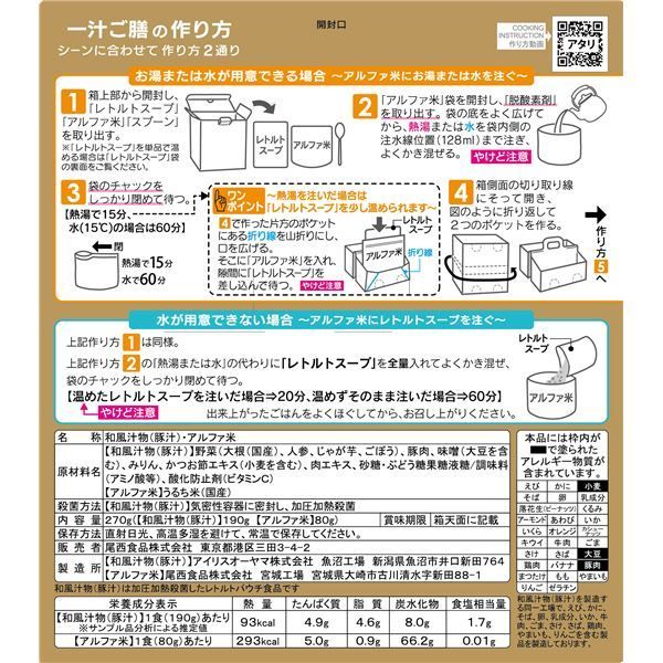 ■原材料名:【和風汁物(豚汁)】野菜(大根(国産)、人参、じゃが芋、ごぼう)、豚肉、味噌(大豆を含む)、みりん、かつお節エキス(小麦を含む)、肉エキス、砂糖・ぶどう糖果糖液糖/調味料(アミノ酸等)、酸化防止剤(ビタミンC)【アルファ米】うるち米(国産)