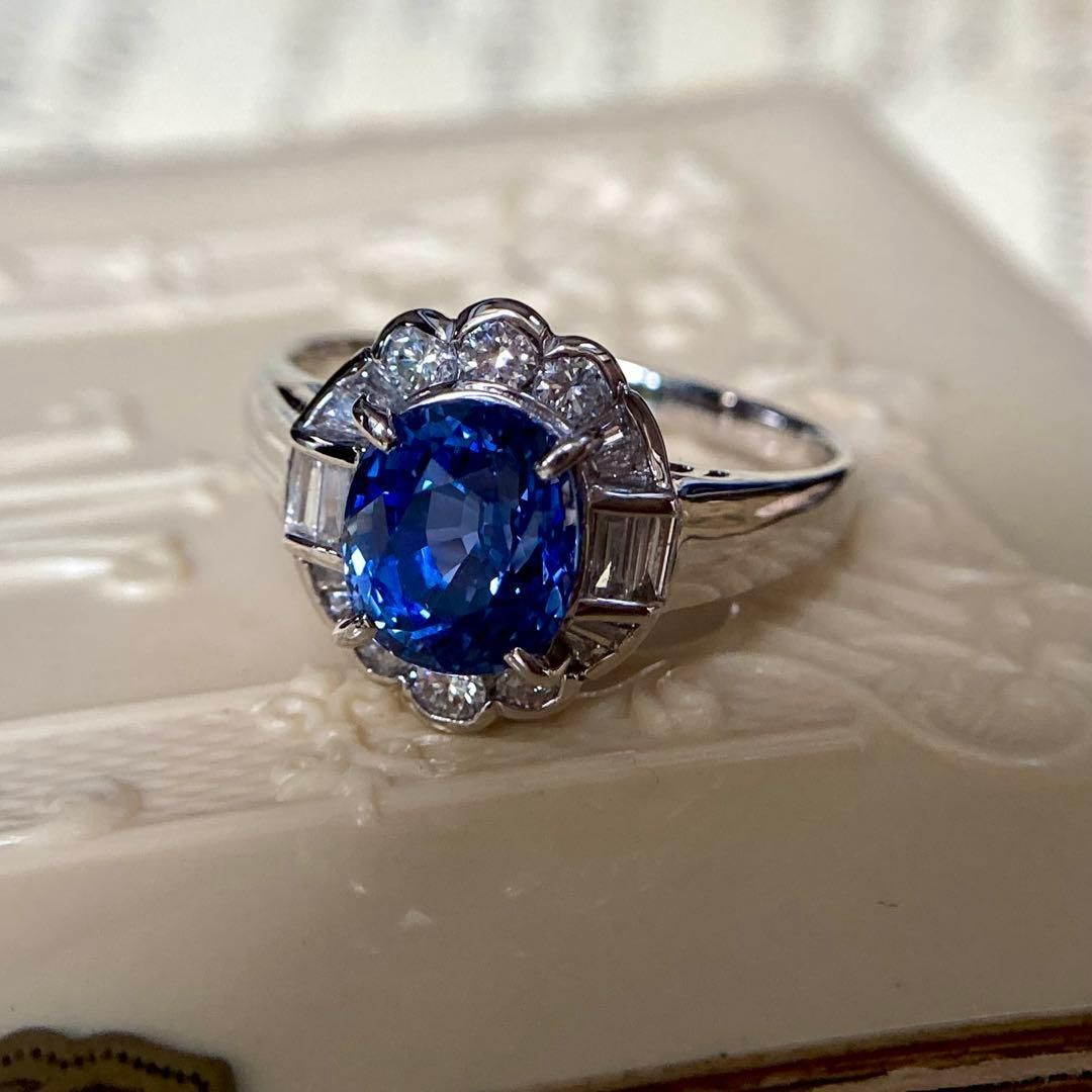 3.47ct 大粒・高透明度 ブルーサファイア ダイヤモンド プラチナリング(バゲット&ラウンドカット)