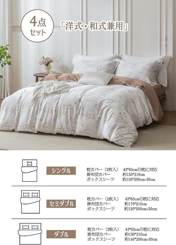 「セット内容詳細」 ・掛け布団カバー:150x210cm(single duvet covers) ・マットレスカバー:100x200cm(厚さ30cm対応) ・枕カバー:43x63cmx2枚(エンベロープ式) *サイズは測定方法により±1~2cmの誤差が生じます