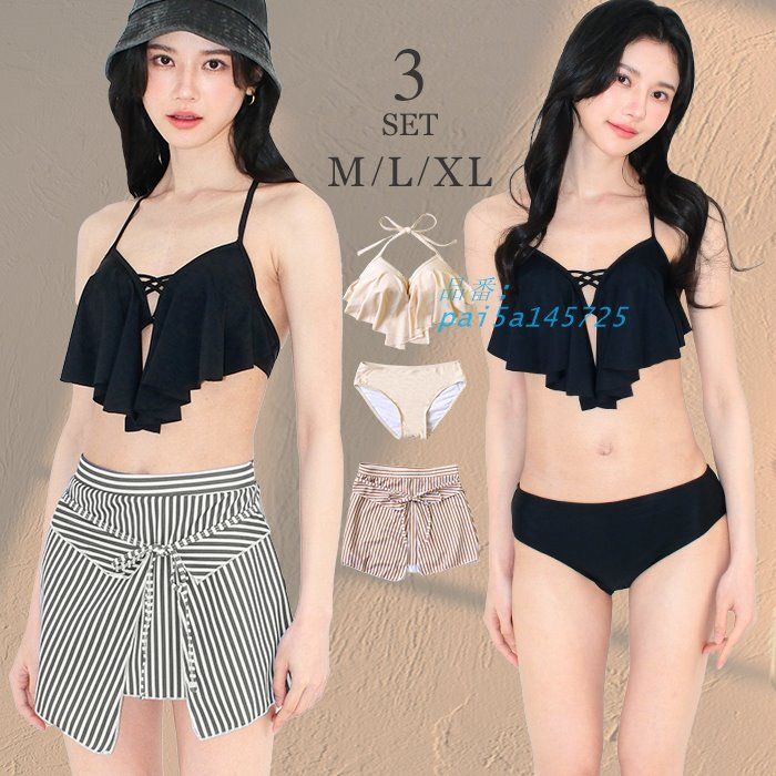 水着レディース ビキニ 3点セット セパレート ワイヤー入り 30代 20代 体型カバー 盛れる ストライプ柄 オトナ女子 おしゃれ スカート付き pai 5 a 145725