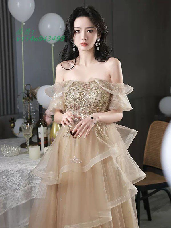 イブニングドレス 大人 ピアノ 発表会 ロングドレス アシンメトリードレス オフショルダー 肩出し 袖付き 成人式ドレス 演奏会用ドレス 二次会 フォーマル 披露宴 ワンピース Aライン パーティードレス シャンパン色 XS S M L 2L 3L 4L T2D7