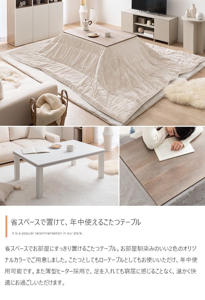 コンパクトサイズでお部屋に省スペースで置けるこたつテーブル。ナチュラルな2色のオリジナルカラーが、お部屋を洗練された印象にさせつつすっと馴染みます。こたつとしてもローテーブルとしてもお使いいただけるので、1年中使用可能です。また、薄型ヒーター採用で足を入れても窮屈に感じることなく、温かくゆったり快適にお過ごしいただけます。
