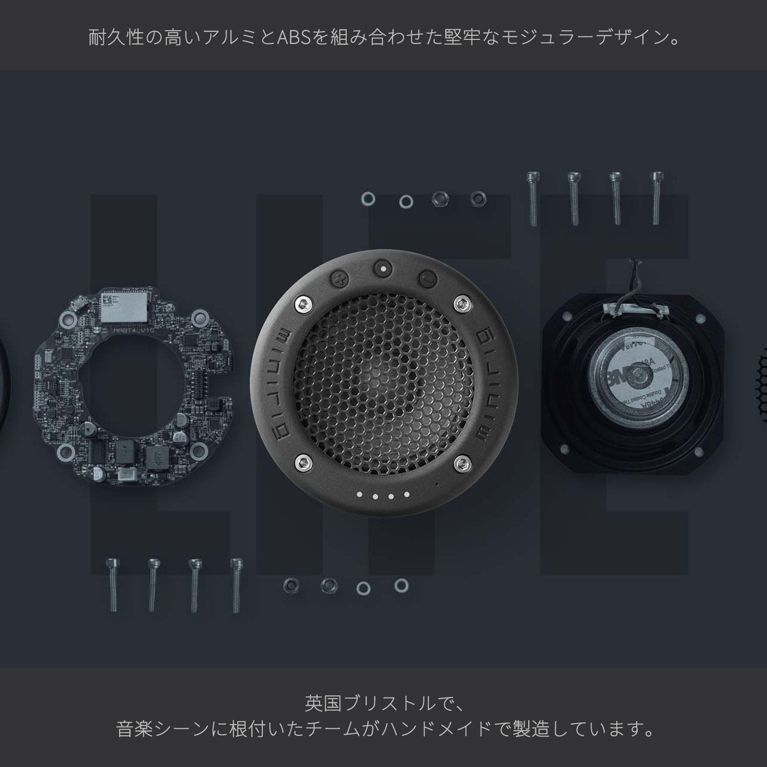・手のひらサイズの大音量ポータブルBluetoothスピーカー。カスタムメイド70mmネオジウムスピーカーと50wアンプを搭載。本体の重量は563g、このサイズ感で最も音量の大きいポータブルスピーカーです。