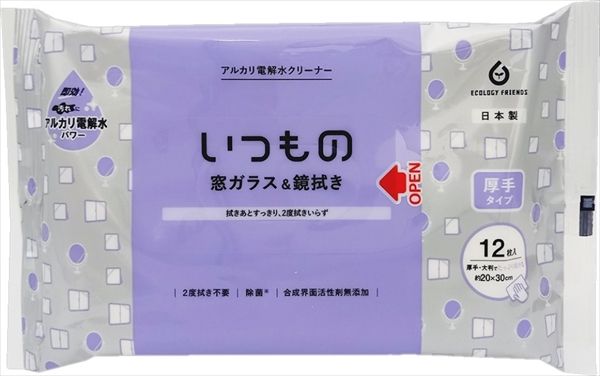 窓ガラスや鏡のお掃除に。水を電気分解して得られるアルカリ電解水を使用しております。アルカリ電解水の働きで汚れをしっかり落とします。厚手のシートだから1枚でしっかりお掃除できます。発酵エタノール配合で衛生的。ベタつきがなく、すっきりとした拭きあがり。