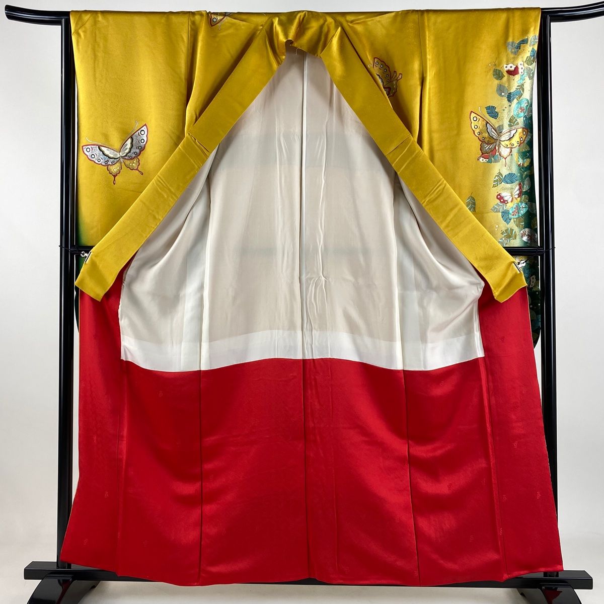 振袖 身丈159.5 cm 裄丈64 M 袷 蝶 葉柄 金銀彩 染め分け 山吹色 正絹 秀品
