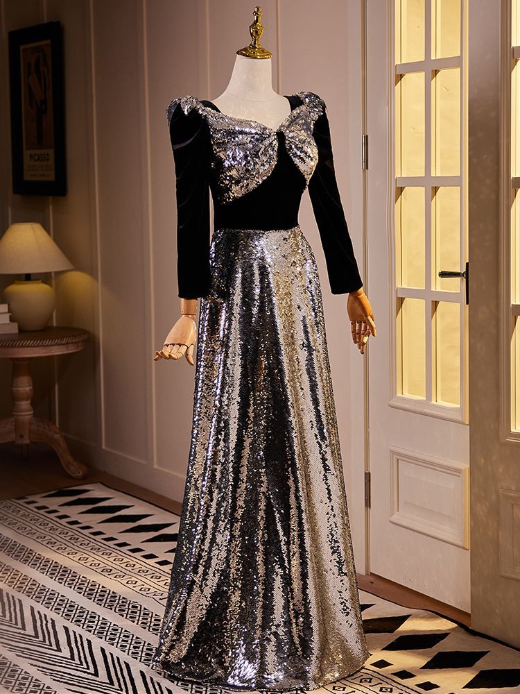 銀色 ロングドレス 長袖 方形ネック 修身デザイン 感 演奏会 パーティー 披露宴 宴会 年会 主催者 舞台ドレス エレガント