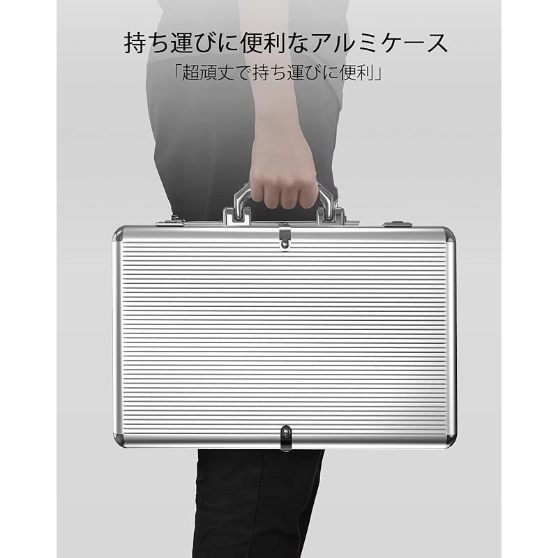 アルミケースのサイズと重量:手提げ用のアルミ製ケースで、丈夫なアルミ素材を使用。長時間の使用にも耐える強度を確保し、耐久性と携帯性を大幅に高めています。ケースのサイズは長さ44cm、幅27.4cm、高さ8.3cmで、重量は4.7kgです