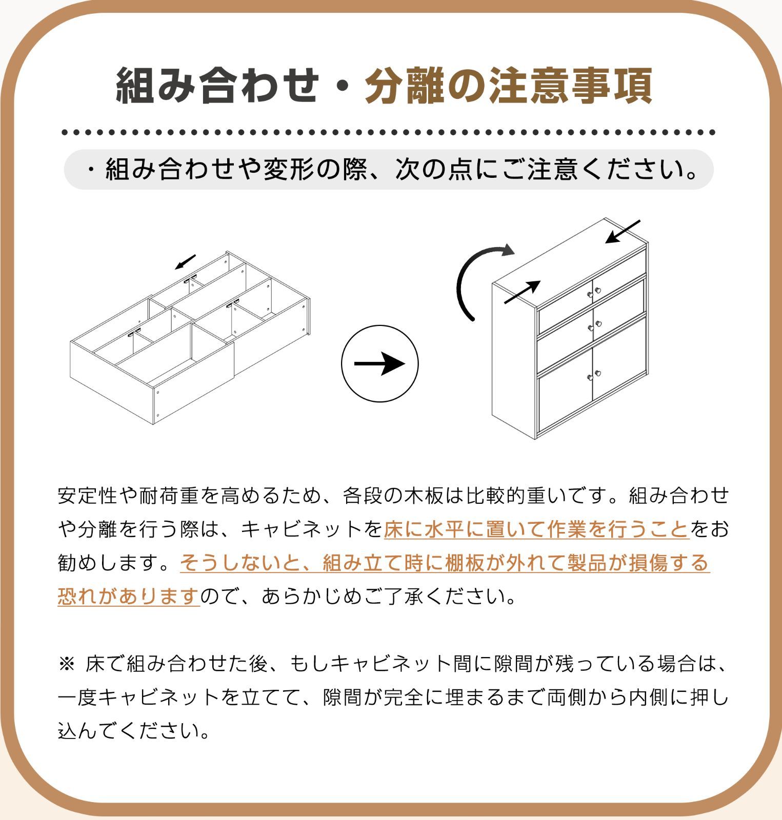 【しっかり固定できる中間連結ネジ付き 】左右側のキャビネットの中央部分には、固定ネジでしっかり連結可能です。ネジは天板裏に隠れる仕様で、見た目を損なうことなく、安定感を高めてくれます。※ 基本形態とL字形態のみネジ固定が可能です。