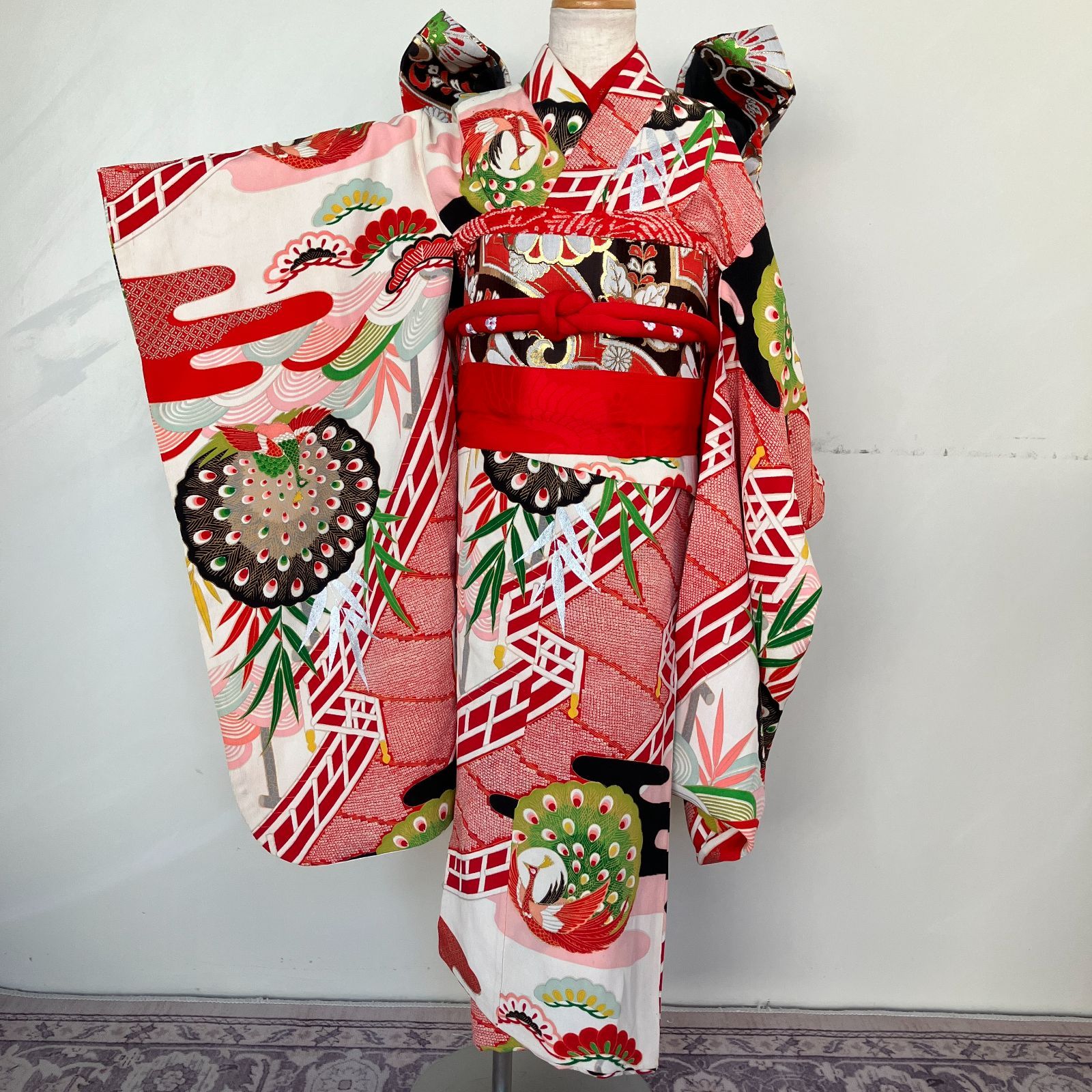 柄 アンティーク 七五三 7歳女の子 着物 四つ身 赤 長襦袢 作り帯セット 帯揚げ帯締めしごき付き ビンテージ きもの猫田 T 325