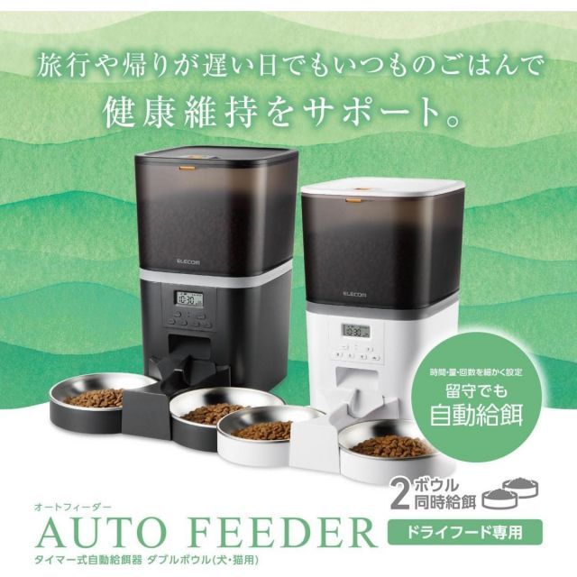 エレコム ELECOM 自動給餌器 中 小型犬用 猫用 6リットル 2皿 2匹 タイマー機能付 録音機能付 ホワイト PET-AF 02 WH ペット用 ドライフード