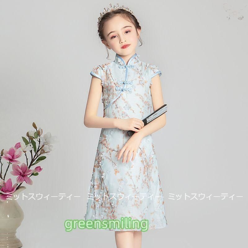 チャイナドレス チャイナ風ワンピース 発表会 子供ドレス ブルー 夏 キッズドレス 女の子 膝丈 フォマールドレス ガールズ ワンピース コス