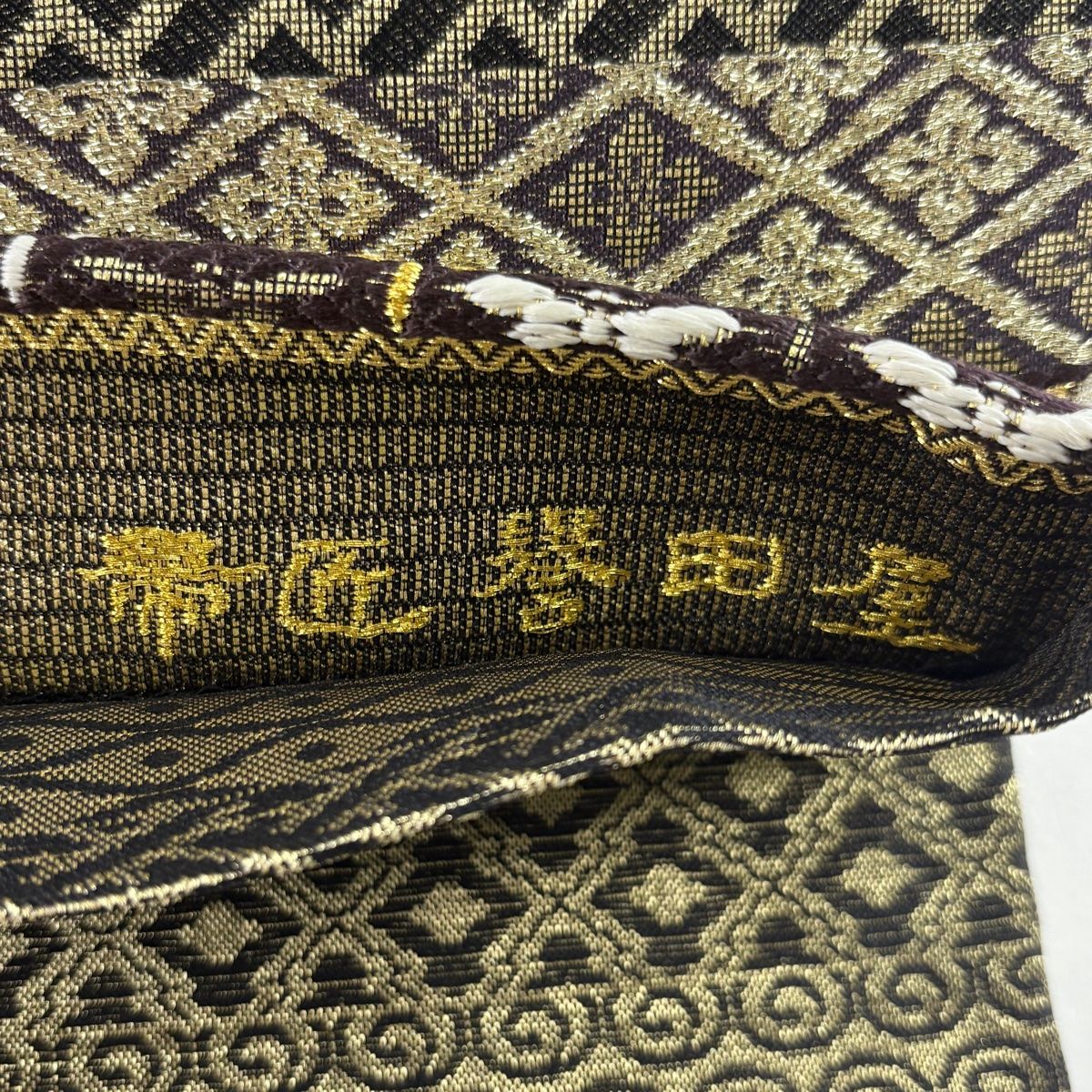 袋帯 誉田屋源兵衛 落款 誉文彫金 段縞 蜀江華文 金銀糸 箔 金茶 全通 正絹