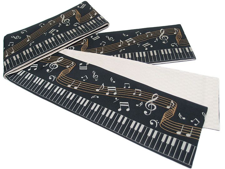 鍵盤と楽譜の柄と矢羽根を織り上げた、