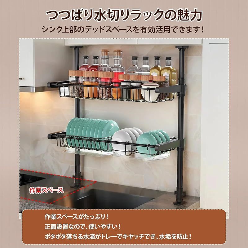 【省スペース設計の利便性】つっぱり式構造で従来品より省スペース、シンク上部の空間を有効活用。正面設置で洗い上げた食器をすぐにラックに置けるため、作業効率がアップ。水滴が直接シンクに流れる構造で、キッチンの乾燥を維持します。