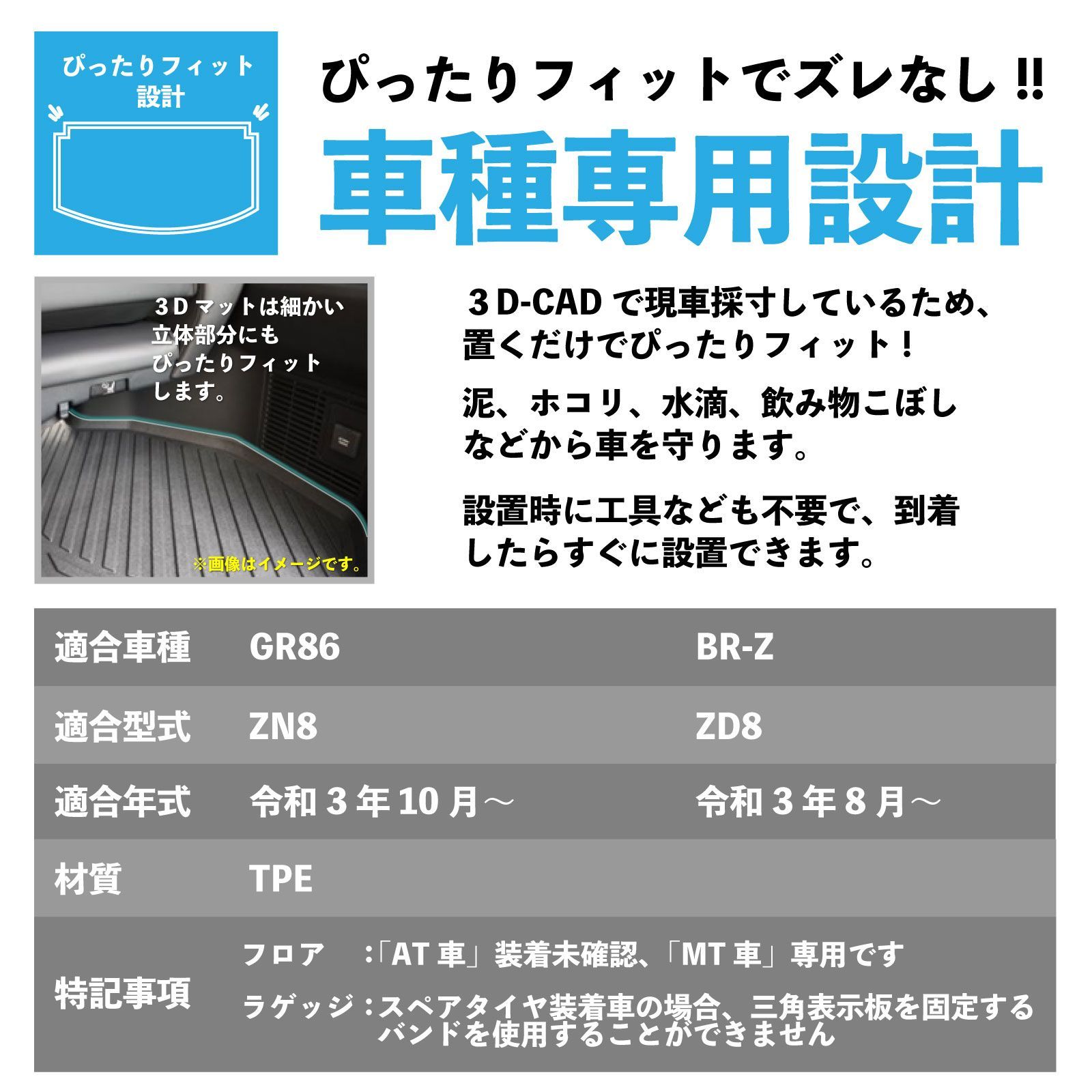 ZN 8 ZD GR 86 BR-Z MT車用 3 D フロアマット 1台分 フルセット 1列目 2列目 ラゲッジ 滑りにくい シボ加工 水や汚れに強い TPE製 足元マット トランクマット カーマット 防水マット FM 092 093