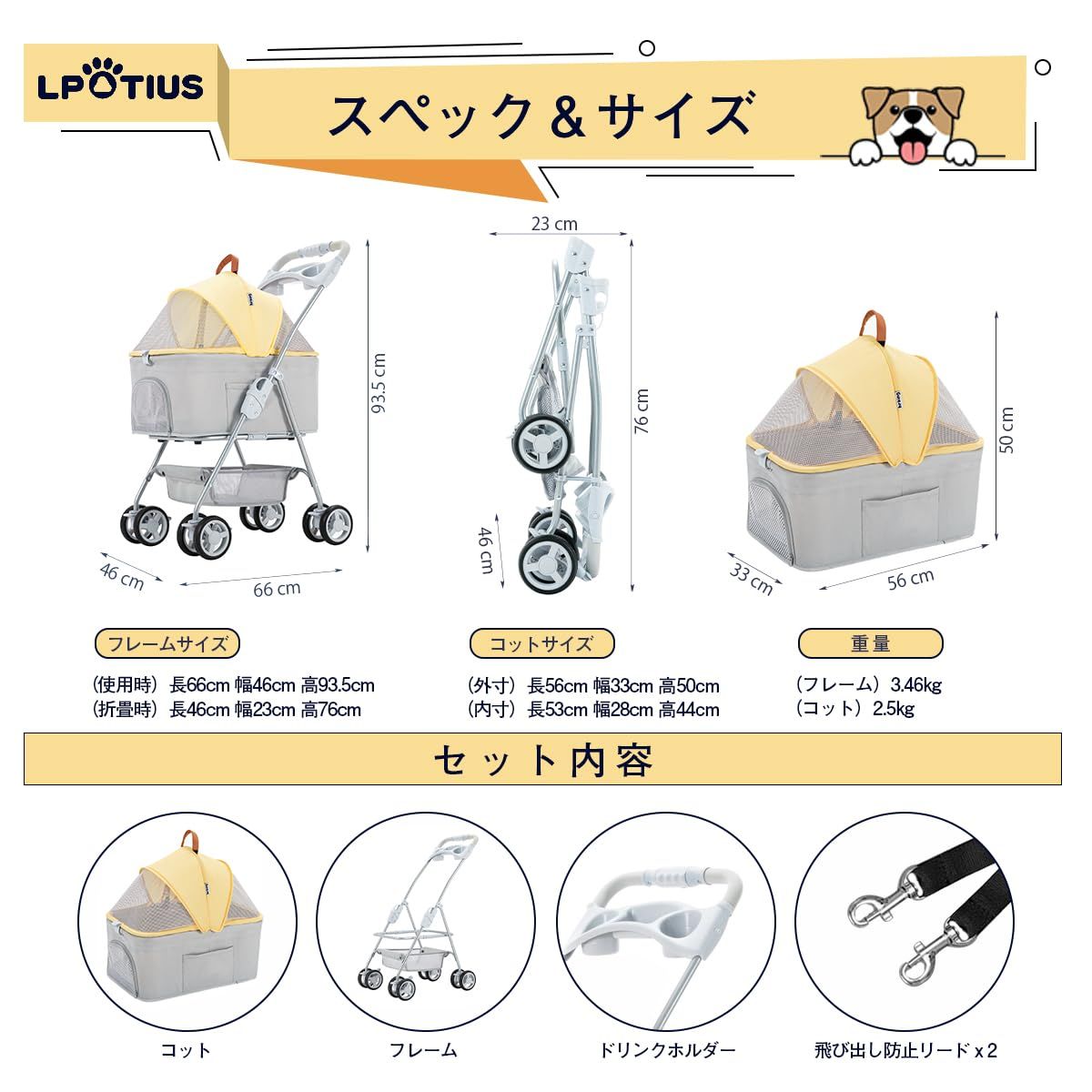 LPOTIUS 折りたたみ ペットカート 2Way 分離型 ペットバギー 中型犬 小型犬 猫 多頭用 ペットキャリー 4輪360°回転 多機能 軽量 犬用 カート 組み立て簡単 お出かけ 散歩 通院 介護用 ペット用ベビーカー 耐荷重15KG (イエロー&グレー)