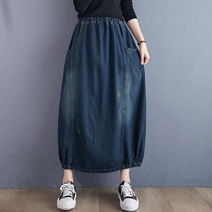デニムスカート レディース 春秋 ロング丈 バルーンスカート ロングスカート デニム ランタンスカート マキシ丈スカート ボトムス ユーズド加工 無地 バルーン 美脚 ウェストゴム カジュアル おしゃれ 体型カバー 春 秋 冬 zJDY 564