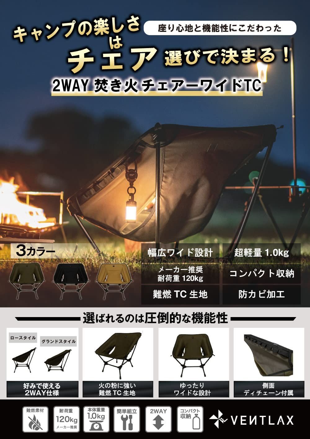 VENTLAX 2WAY焚き火チェア ワイドTC 難燃ポリコットン 火の粉に強い ハイ/ロー切替可能 ローチェア グランドチェア