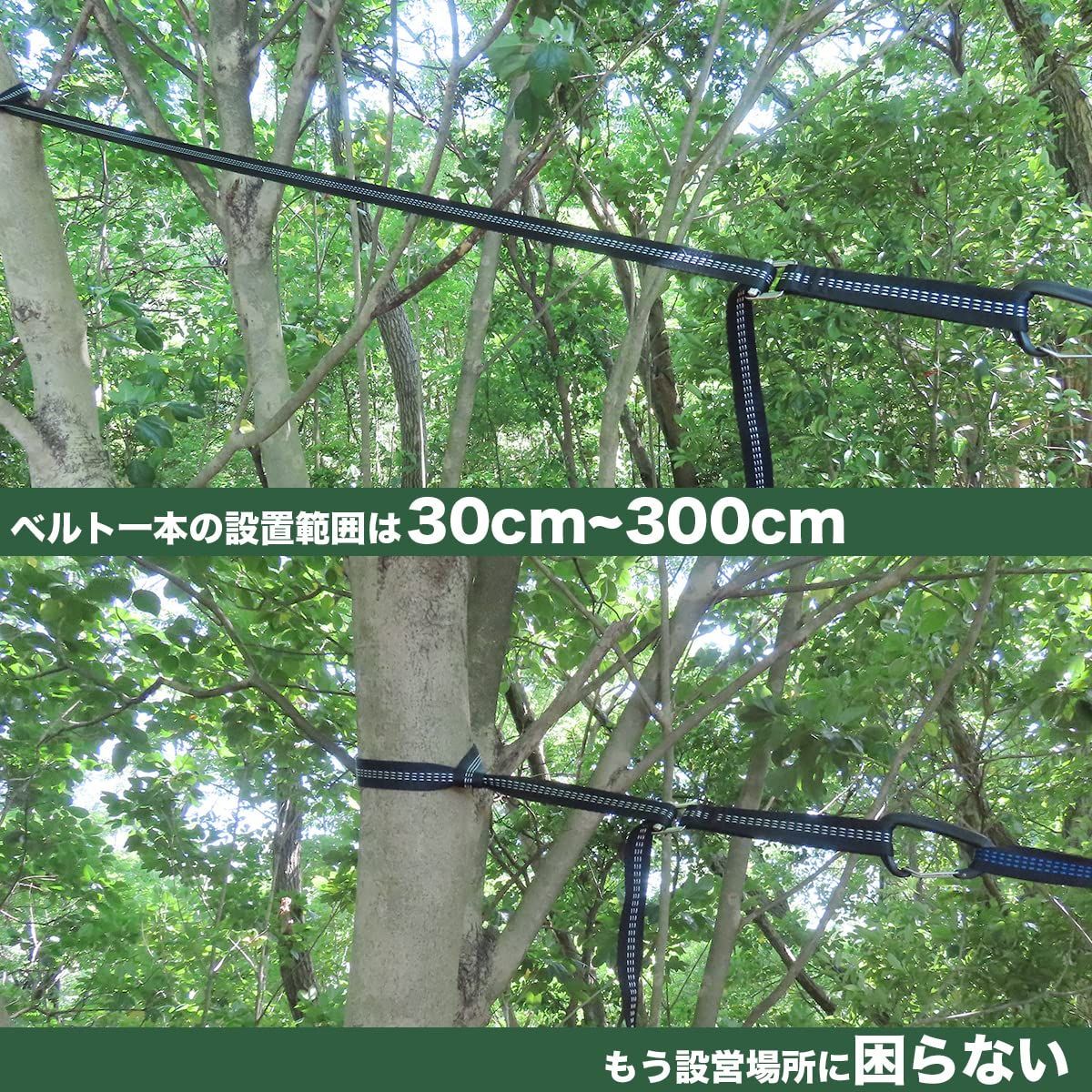【設置場所に困らない】ハンモックベルトの長さは1本30㎝~300㎝で調整可能!狭い場所でも広い場所でも簡単に設営出来ます。今まで諦めていた場所でもハンモックを楽しめます。