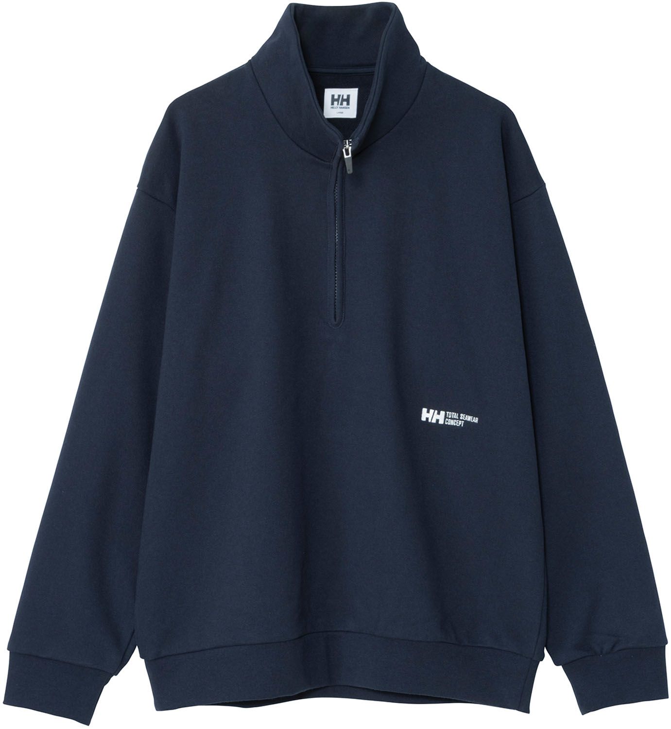 初登場のシンプルなスウェットハーフジップ。源より少し下の位置に小さめの HH ロゴを配し、その横に刺しゅうで TOTAL SEAWEAR CONCEPT と入ります。リサイクルポリエステルの裏毛仕様は、冬場でも暖かく晴れた日などに重宝します。