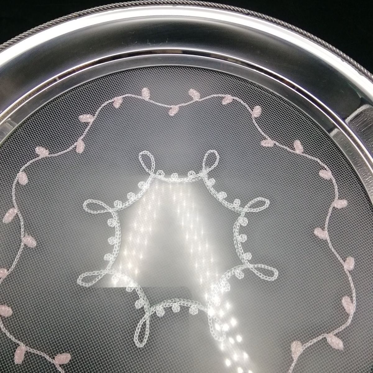 WMF Cromagan Germany 刺繍レース ネット ガラス ステンレストレー 丸トレー 脚付き ヴィンテージ