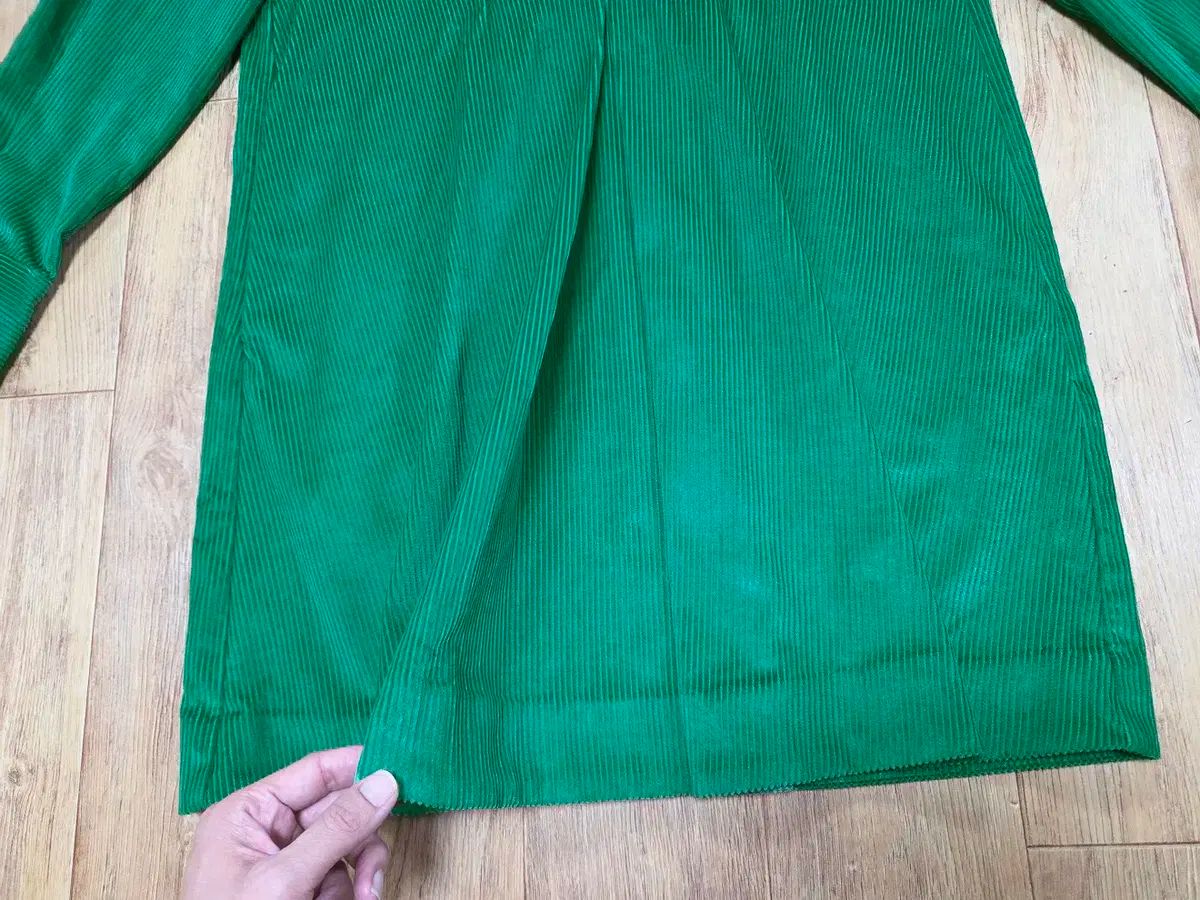 写真より鮮やかなグリーンカラーで、上部ボタン留め、