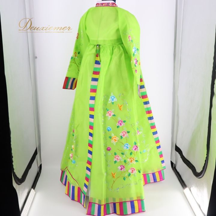 韓国伝統 衣装 チマチョゴリ コスチューム 韓国 コリアン グリーン系 黄緑 ピンク系 花柄 柄 模様 カラフル 蛍光色 セット イベント 韓服 伝統衣装 パーティー お祝い フォトスポット お祝い事