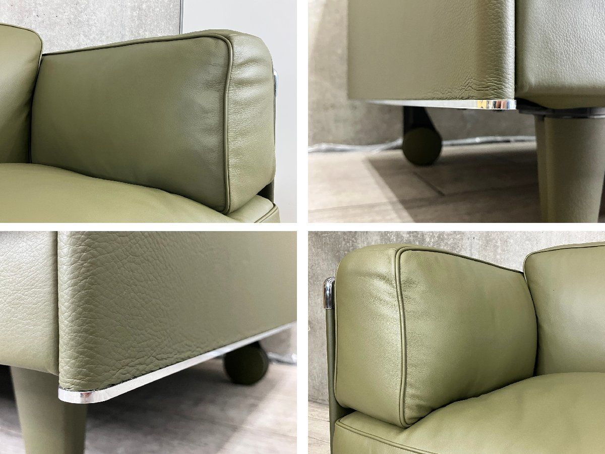 ■Poltrona Frau (ポルトローナ・フラウ)の TWICE 3人掛けソファです外側を直線的なフレームに囲まれた、特徴的なデザインのソファ「トゥワイス」。フレーム内に配されたクッションは身体をしっかりとサポートし、この上なく快適な掛け心地になっています。背・アーム・座と、まさに包まれるような感覚を覚える逸品で、デザインの特徴はクラシカルとモダンの融合です。上品で気品あふれる佇まいと、あえて見せたいデザインの後姿、どれをとっても美しく、厚手の本革を丁寧に縫い合わせており、縫製からも上質さが感じられます。