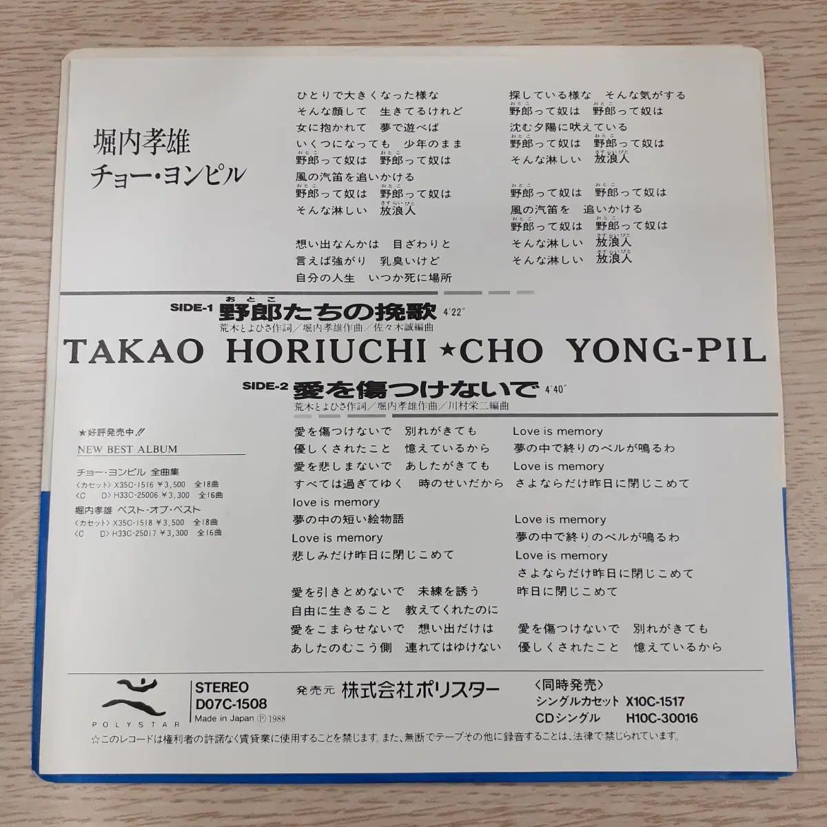 チョー・ヨンピル直筆サイン入り日本シングルレコードです。7インチEPレコードで、ジャケットにチョー・ヨンピルと堀内孝雄の直筆サインが入っています。
