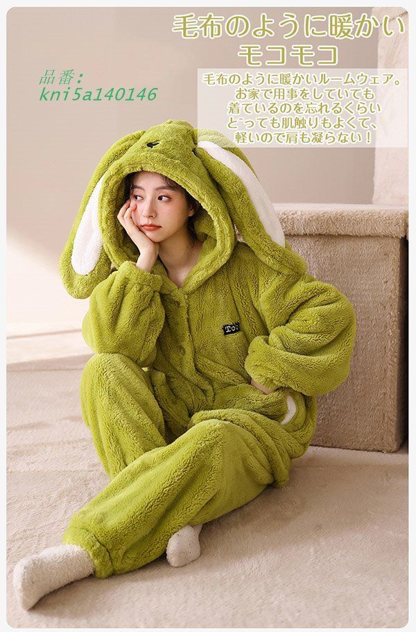 ルームウェア もこもこ 動物 レディース ウサギ耳 着る毛布 可愛い 冬 長袖 大きいサイズ 秋冬 上下セット パンツ 上下 ズボン パジャマ 部屋着 ふわふわ あったか かわいい 緑S1M3