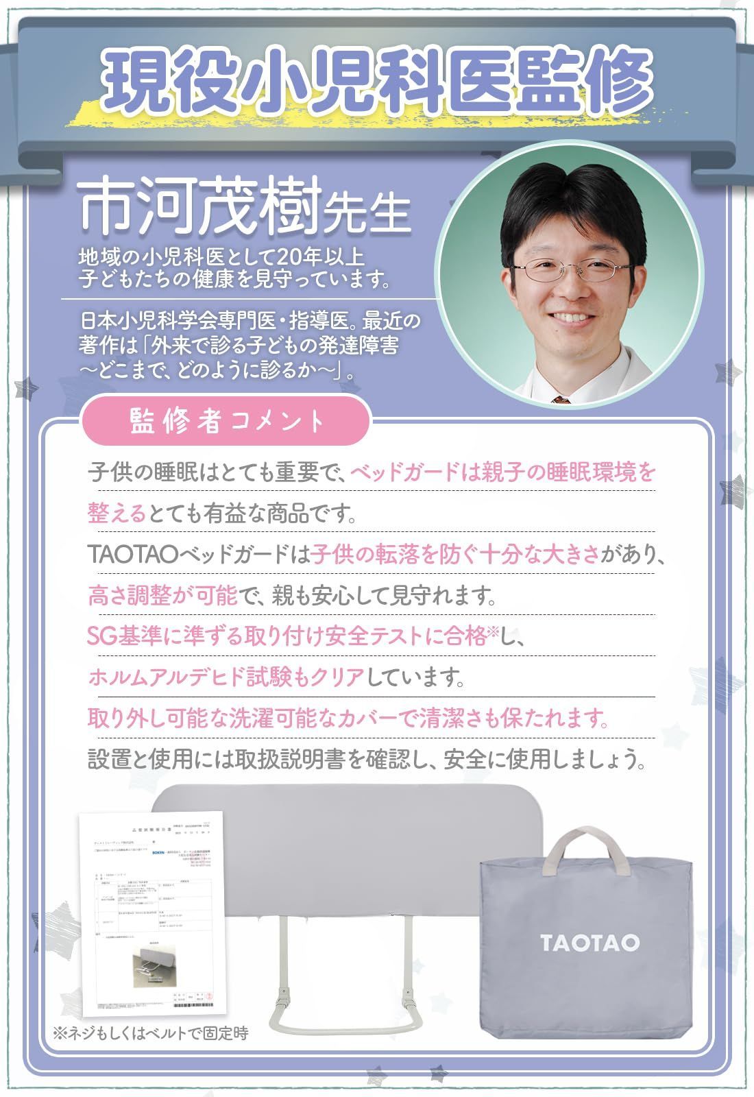 【現役の小児科医と共同開発】TAOTAOベッドガードは、子供がベッドから転落するのを防止するのに十分な大きさがあり、高さ調整も可能で、子供の安眠をサポートします。 それによって親も安心して、子供を見守ることができます。