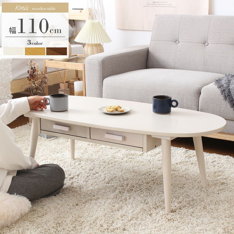 小物を収納できる引き出し付きでお部屋スッキリ♪まあるいカタチが可愛い、木製ローテーブル。丸くて可愛い卵型の楕円形フォルムに、ぬくもりのある木の質感が空間を優しく包み込む、引き出し付きローテーブル・クライス。全体的に丸みを帯びた優しいデザインは、北欧風のナチュラルな雰囲気を演出。安全面も配慮しており、小さなお子様のいらっしゃるご家庭でも安心です。天板下には小物が整理収納できる引き出し付きで、使い勝手も良いデザインに仕上げました。引き出しは前後どちらからでもお使いいただけるので、頻繁に出し入れする物は手前に、普段あまり使わない物は奥に入れるといった使い方もできて便利です。こちらは存在感のある幅110cmタイプで、2〜3人掛けソファとの相性抜群。1人暮らしはもちろん、家族で集まるリビングにもぴったりのサイズ感です。カラーはシックで落ち着きのあるブラウン、温かみを感じるナチュラルに、フェミニンな印象のホワイトを加えた3色展開。お部屋の雰囲気に合わせて選べるカラー展開で、コーディネイトの幅が広がります。サイズ本体:幅110×奥行48×高さ37cm引出内寸(1杯あたり):幅24.5×奥行33.5×深さ5cm素材天板:化粧繊維板、塗装 / 脚部:天然木、塗装仕様カラー:ブラウン/ナチュラル/ホワイト引出は両側から使用可能耐荷重:天板10kg、引出5kgお客様組立品(脚部のみ取付)※除光液などの溶剤は塗装の剥がれの原因となりますので、テーブル周りでのご使用は十分ご注意ください。