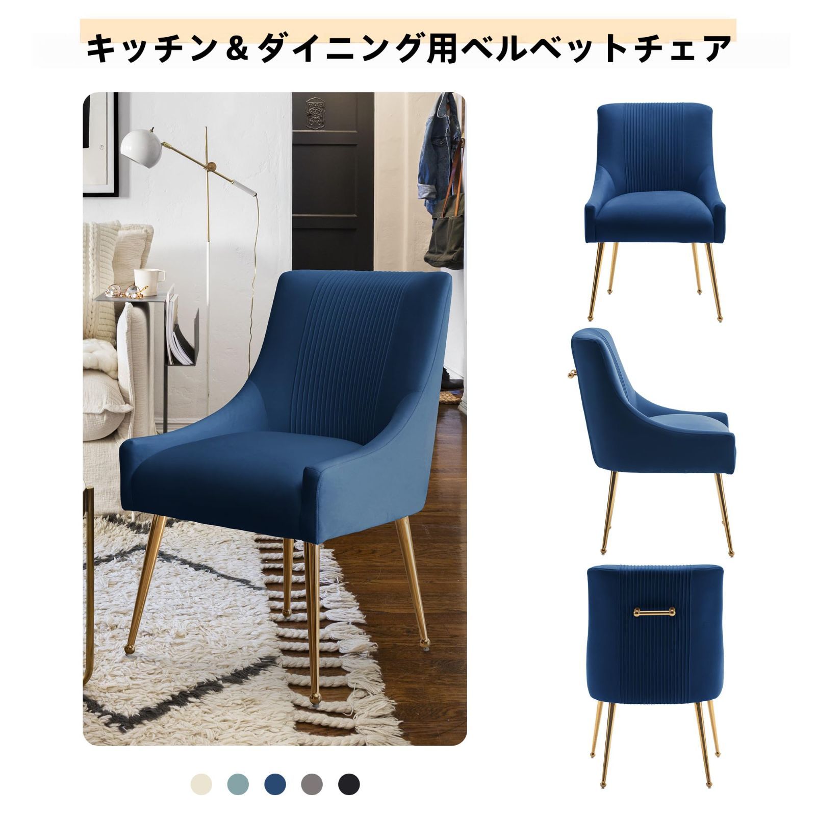モダン ダイニングチェア ベルベット張り ゴールド脚 タフテッドデザイン 2脚セット ダイニングルーム リビングチェア 書斎 受付 北欧風 コンパクト おしゃれ ミッドセンチュリー(ネイビー)