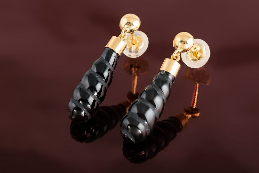 本商品は、18金(イエローゴールド)の枠に#螺旋状 にカットされたブラックカルセドニーが垂れ下がる#デザイン のピアスです。