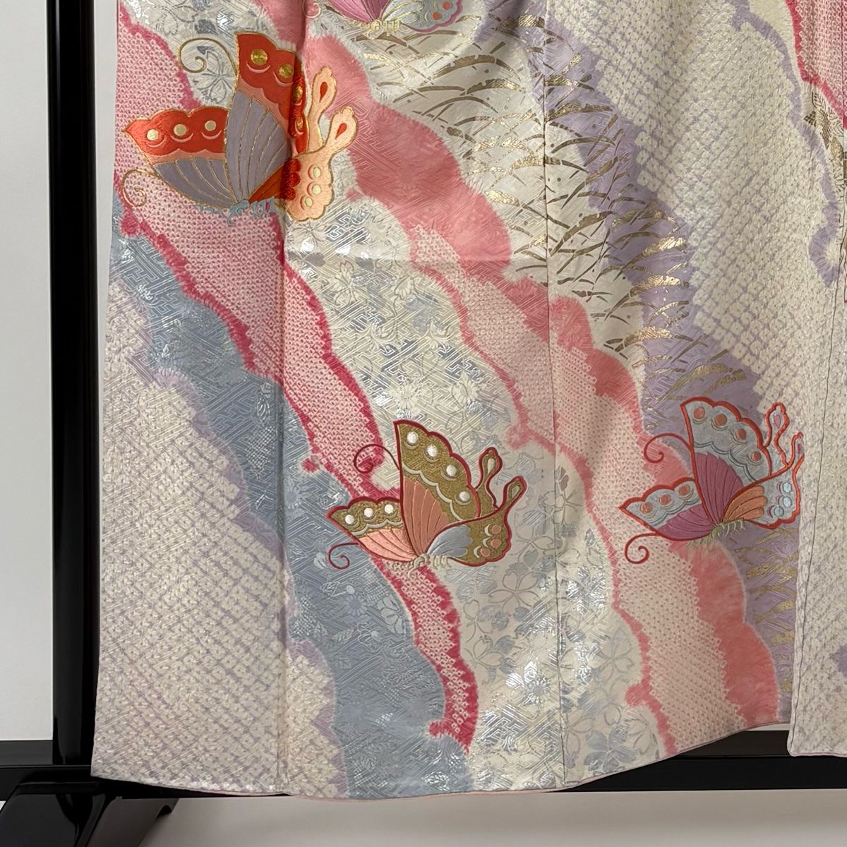 振袖 身丈157 cm 裄丈61.5 S 袷 蝶 雪芝 刺繍 金銀彩 薄ピンク 正絹 秀品