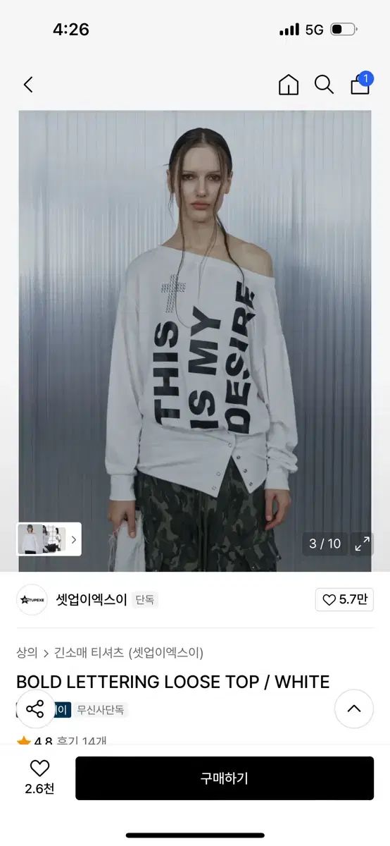 白セットアップEXルーズトップスです。片方の肩を出し、レタリングプリンティングがポイントのデザインです。