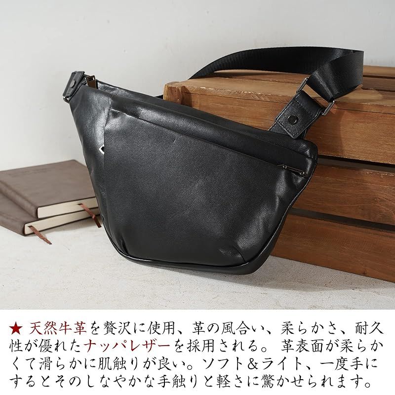 【製品情報】素材:本革(ナッパレザー・厳選牛革)、カラー:ブラック色、【サイズ】横40cm×縦16cm×マチ1.5cm、ショルダーベルト調節可能長さ:63cm~117cm*幅3.5cm、【重量】約0.4kg、【仕様】メイン収納ポケット*1、内部:小物入れポケット*2、ZIPポケット*1、前ZIPポケット*2、後ろマグネット式ポケット*1