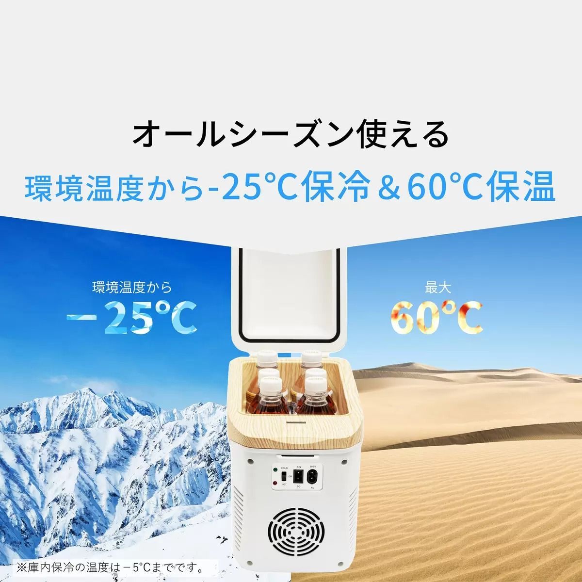 ●庫内温度:環境温度-25度・最大約60度(ただし、-5度までが限界)