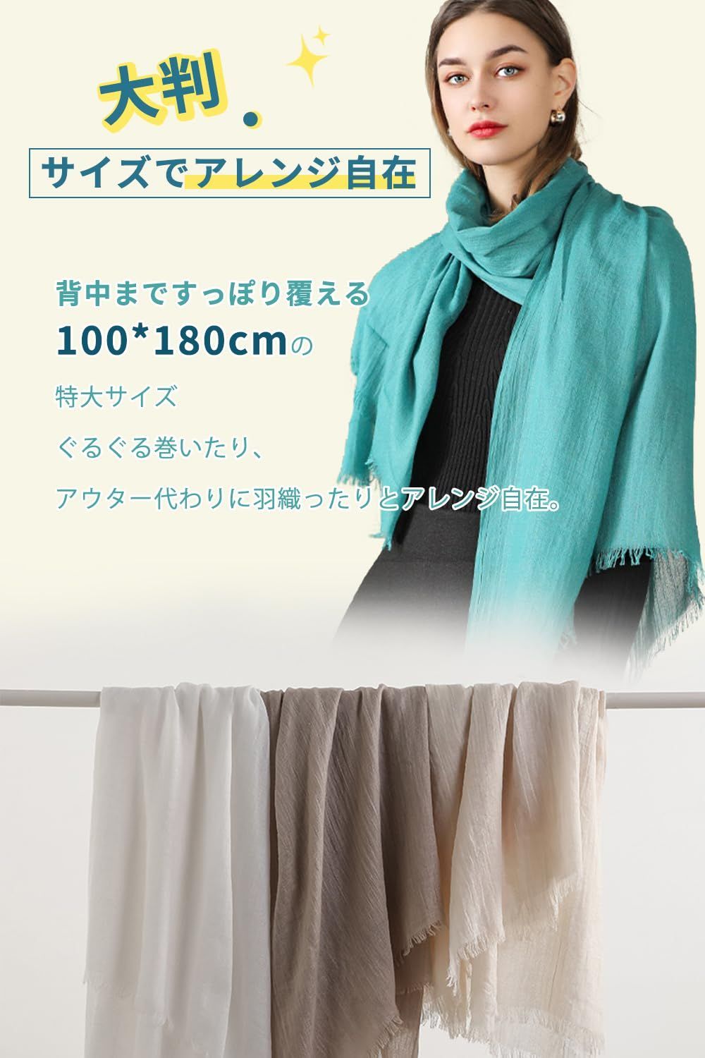 【ふんわり・柔らかい生地・接続冷感】素肌に優しいコットン・リネン混紡厳選した素材で編み上げた、大判のマフラーです。触れるとほんのり涼しく感じる肌触り、心地良いひんやり感が伝わります。通気性・放湿性にも優れ、汗をしっかり吸水・放湿し、爽やかに保ちます。夏も快適にご使用いただけます。