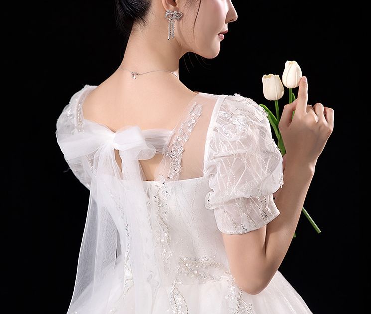 2025年新作のフランス風ウェディングドレスは、夏にぴったりのショートスリーブデザインが特徴です。白色の清潔感ある色合いと宮廷風のエレガントなデザインが新婦を華やかに演出します。スリムに見せるシルエットが体型を美しく引き立て、膝丈のドレスが軽やかで動きやすいです。夢幻的な雰囲気を持つデザインで、特別な日にぴったりの一着です。