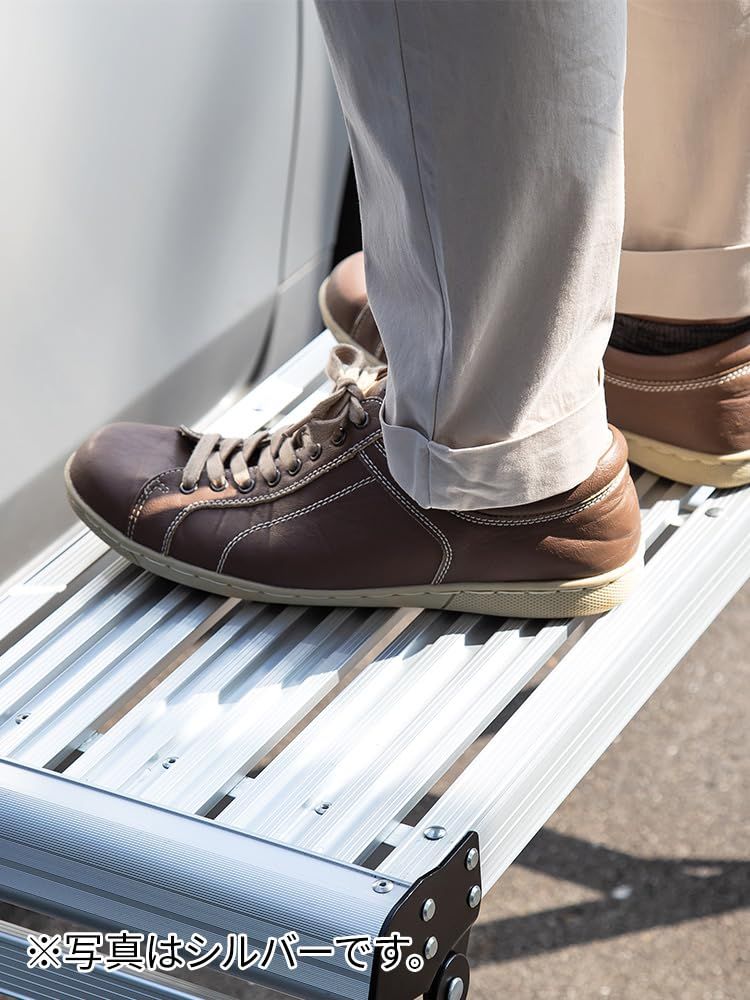 【軽い・広い・折りたためる】軽くて錆びにくいアルミ製の、折りたためる足場台です。横幅76cm×奥行き30cmの幅広ステップで、道具も緒に置いて使えます。