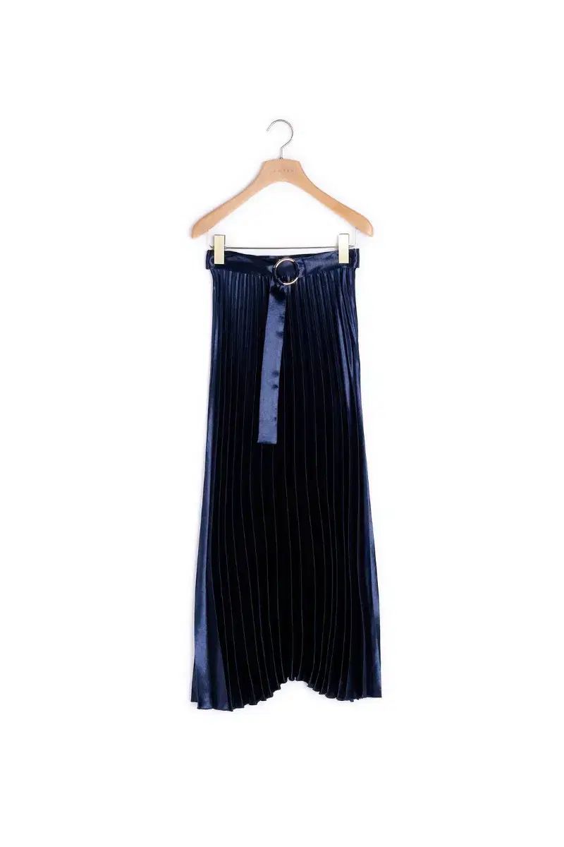 少し光沢のあるネイビーのプリーツスカートには、ウエストラインを強調する取り外し可能なベルトが付いています。