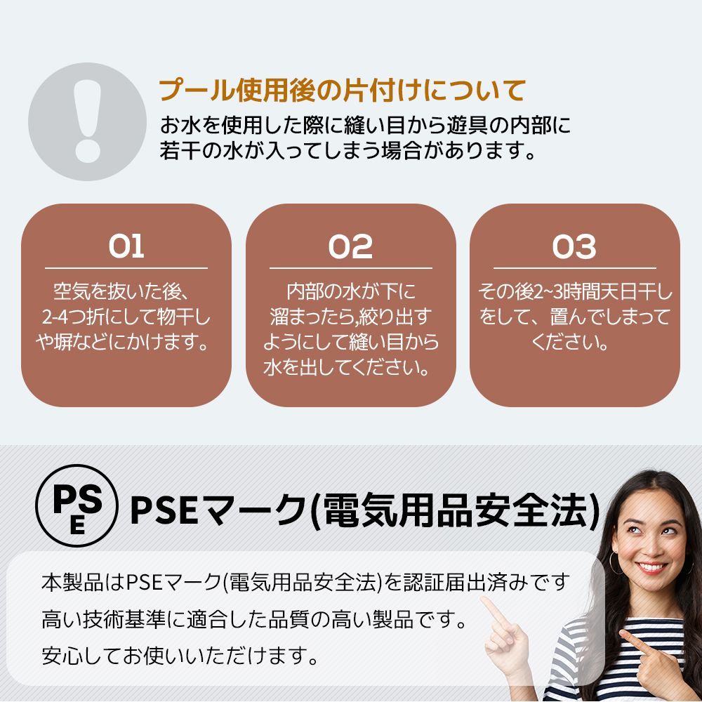【プール使用後の片付けについて】お水を使用した際に縫い目から遊具の内部に若干の水が入ってしまう場合があります。 01 空気を抜いた後、2~4つ折にして物干しなどにかけます。 02 内部の水が下に溜まったら絞り出すようにして縫い目から水を出してください。 03 その後2~3時間天日干しをして、畳んでしまってください。