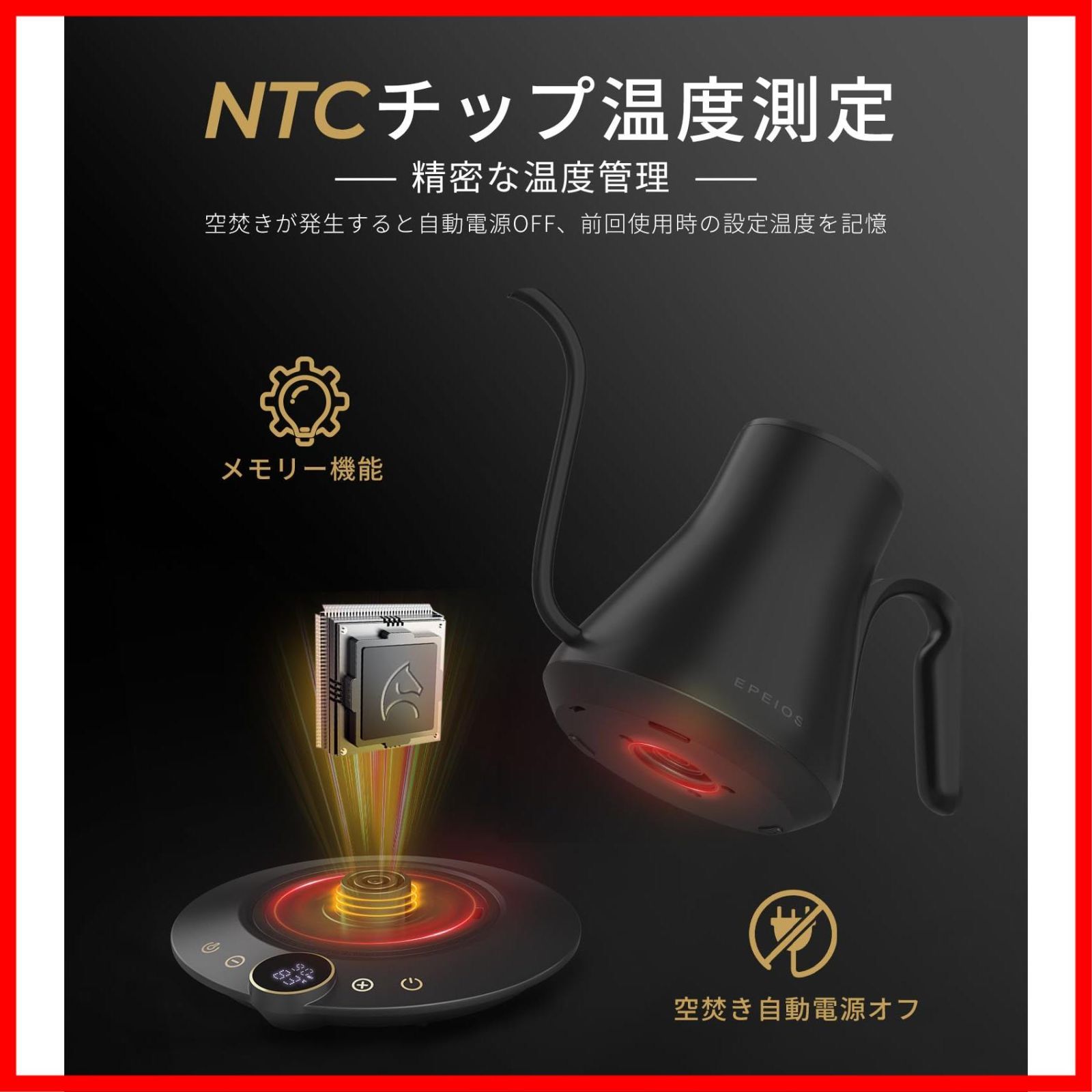 電気ポット LED表示パネル 細口ドリップ ドリップ ポット コーヒーポット 1° C単位の精密調節 コンパクト0 9 L コーヒー 電気ケトル 1040 W エペイオス Epeios