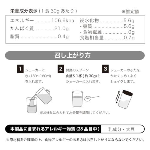 【おすすめの飲み方】シェイカーに150?180mlの冷水や牛乳と、本製品を付属スプーン山盛り1杯(約30g)を入れて、蓋を閉めた後、10秒(20回)ほどシェイクしてお召し上がりください。
