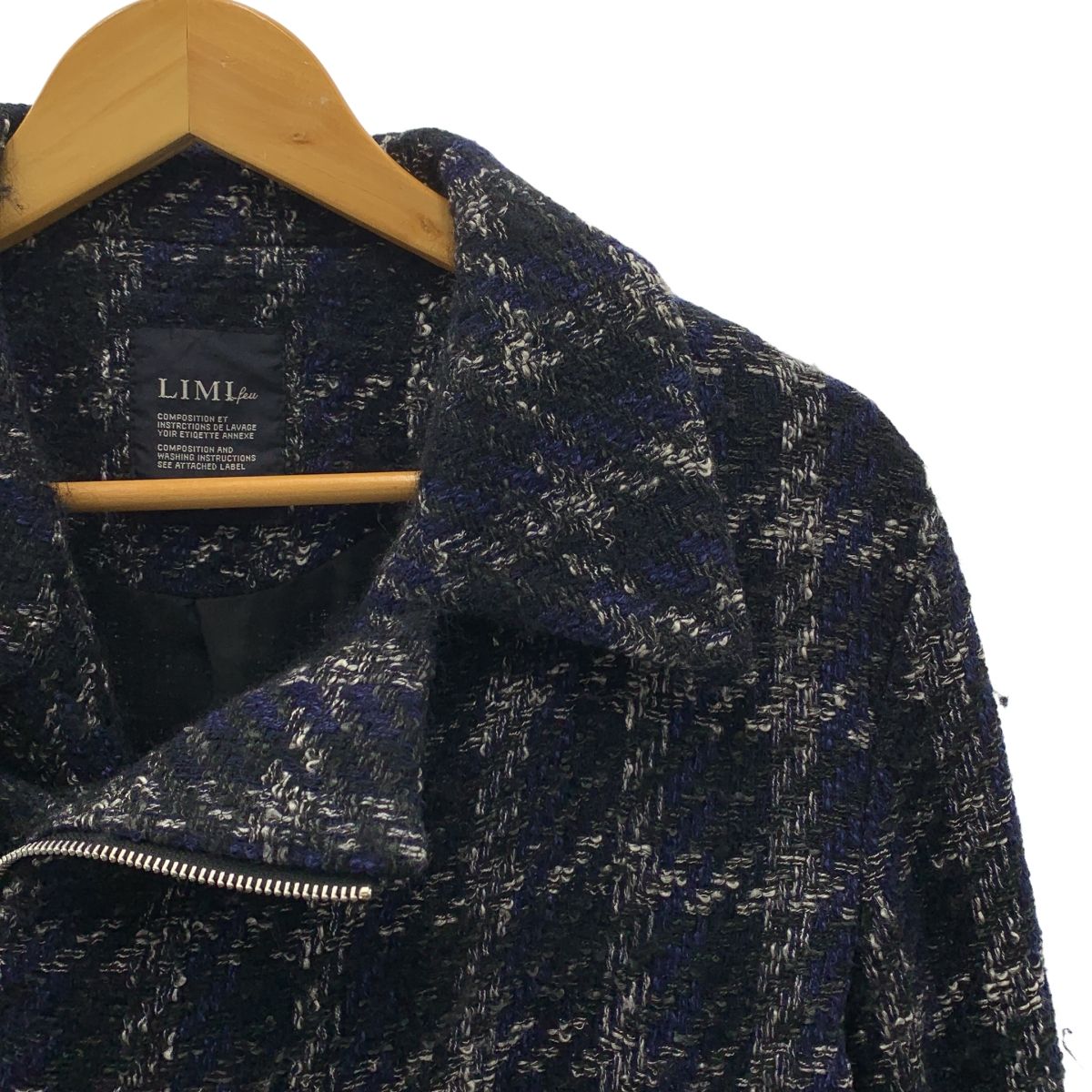 LIMI feu リミフゥ ツイード ブルゾン ダブルジップ ジャケット S ブルー ブラック ホワイト レディース